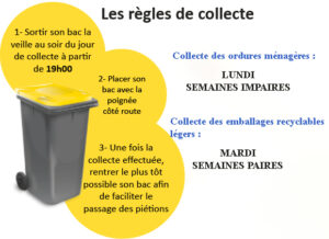 Information sur la date des collectes des ordures ménagères, des emballages recyclables légers et des encombrants.
