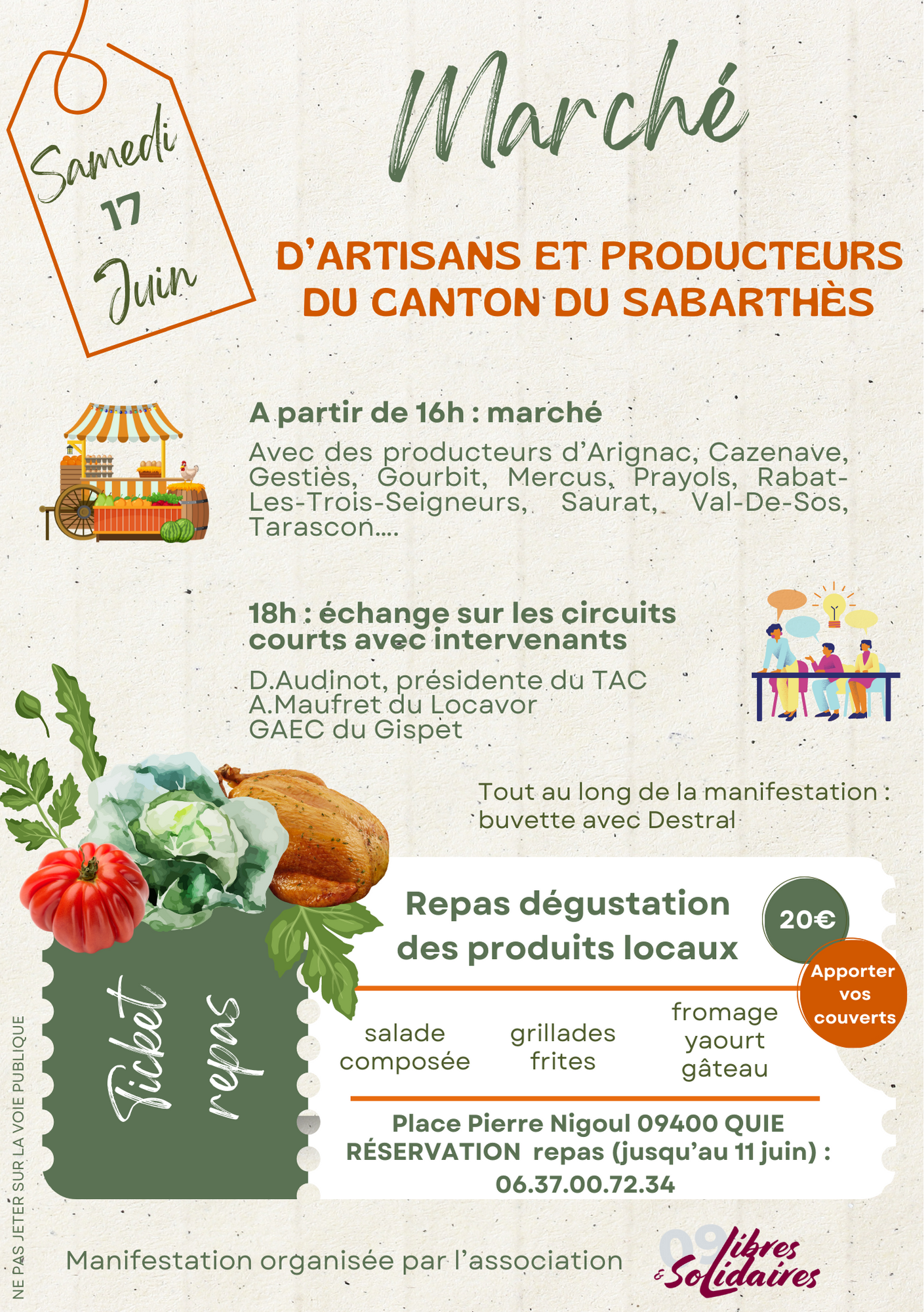 L’Association Libres et Solidaires 09, organise un marché d’artisans et de producteurs du canton du Sabarthès, suivi d’un repas, à Quié le samedi 17 juin 2023.